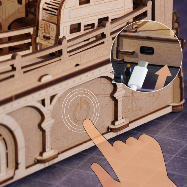 The model is powered automatically via a USB‑C connection, so once the track is assembled the marbles will move on their own. Once assembled, it also functions as a decorative piece.